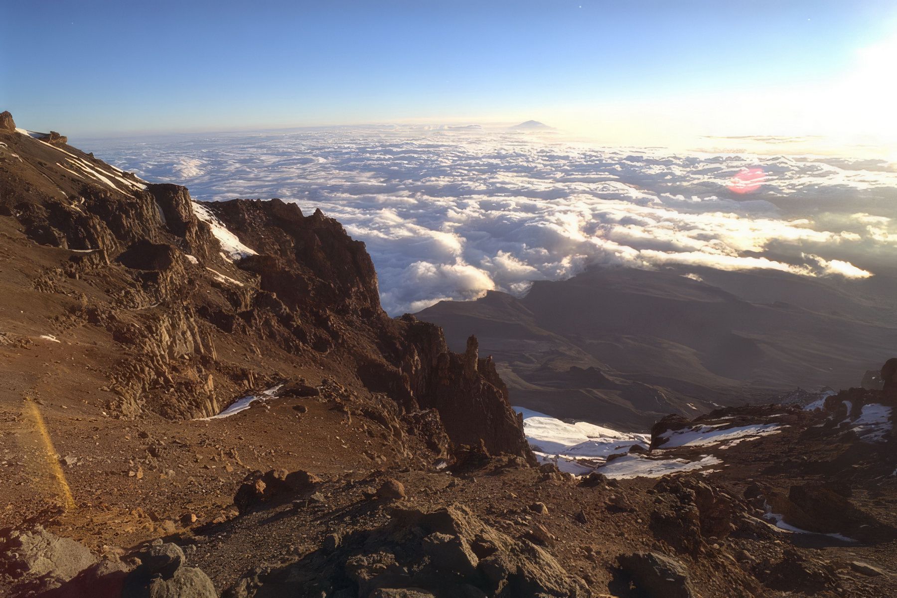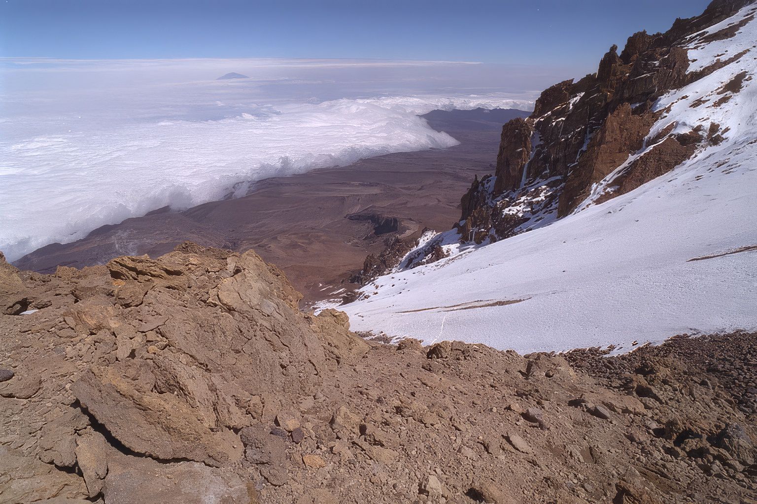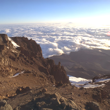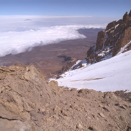 The highest mountain in Africa, located in Northeast Tanzania, near the Kenya border. Born of the catastrophic movements in the Earth's crust that created the Great Rift Valley that runs from the Red Sea through Tanzania to Southern Africa, Kilimanjaro is an extinct volcano, and is one of the most massive in the world.