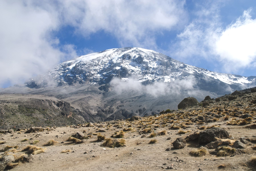 Mt Kilimanjaro Tanzania is the Everest of Africa, with its summit close to the altitude of Mt. Everest's base camp. Yet Kilimanjaro does not stand out as the highest peak in a snow-capped mountain range. It rises in complete isolation in a land of flat plains grazed by elephants, zebras and other African animals. Few large animals are found in this zone though colobus and blue monkeys can often be seen but other inhabitants such as smaller antelopes an leopards are very shy. Many colourful birds are found here, the most noticeable being the Hornbill and the Turaco with its dark red wing markings. Eagles and buzzards soar high above and smaller birds such as the alpine chat and streaky seed eater can also be seen.